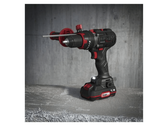 • Set completo trapano-avvitatore a percussione, comprensivo di 2 batterie (2 Ah), caricabatteria (3,5 A) e set di 98 accessori